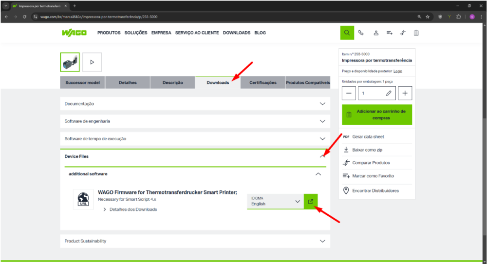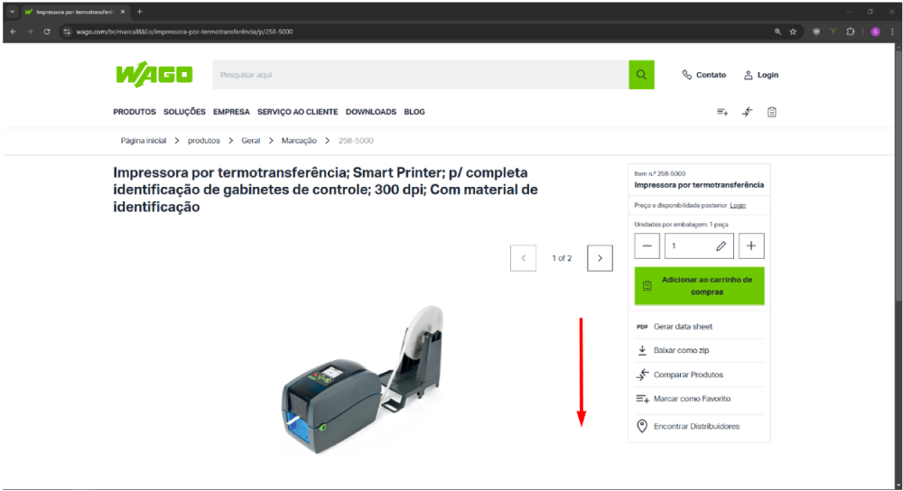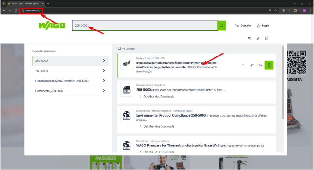 Em seguida, acesse o site da Wago, digite o código encontrado na barra de pesquisa e abra página do produto.