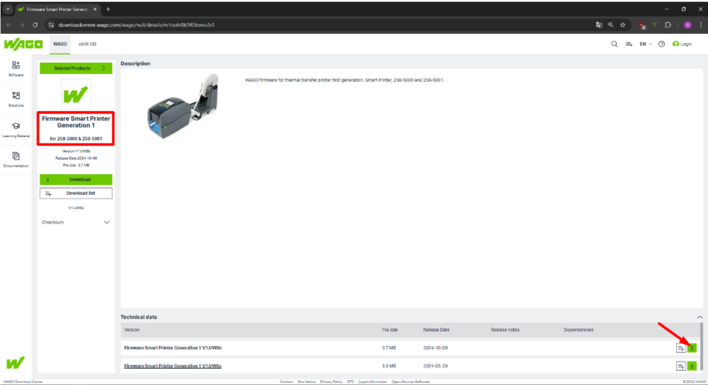 Na sequência, você será redirecionado para a página do firmware da impressora, verifique no canto superior esquerdo se de fato está na página correta para o seu modelo. Após a confirmação, clique no ícone verde ao lado do firmware mais recente.