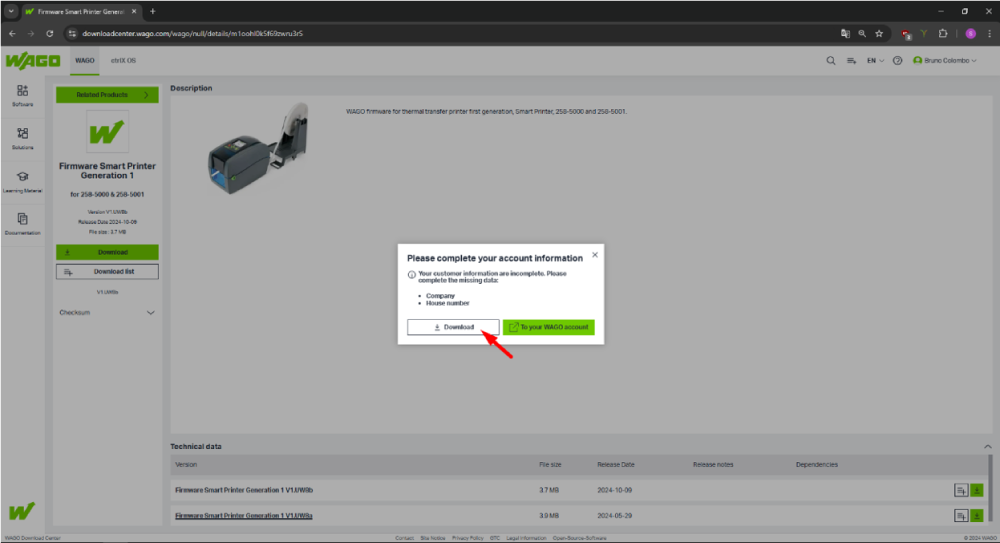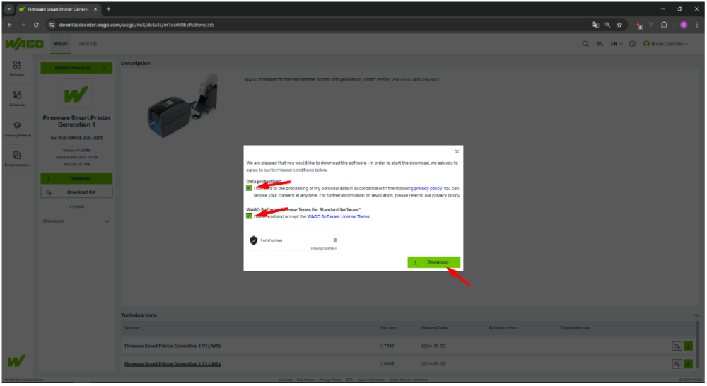 Uma nova caixa de diálogo será aberta, clique em Download, marque que você está de acordo com os termos de uso da Wago e selecione Download novamente.