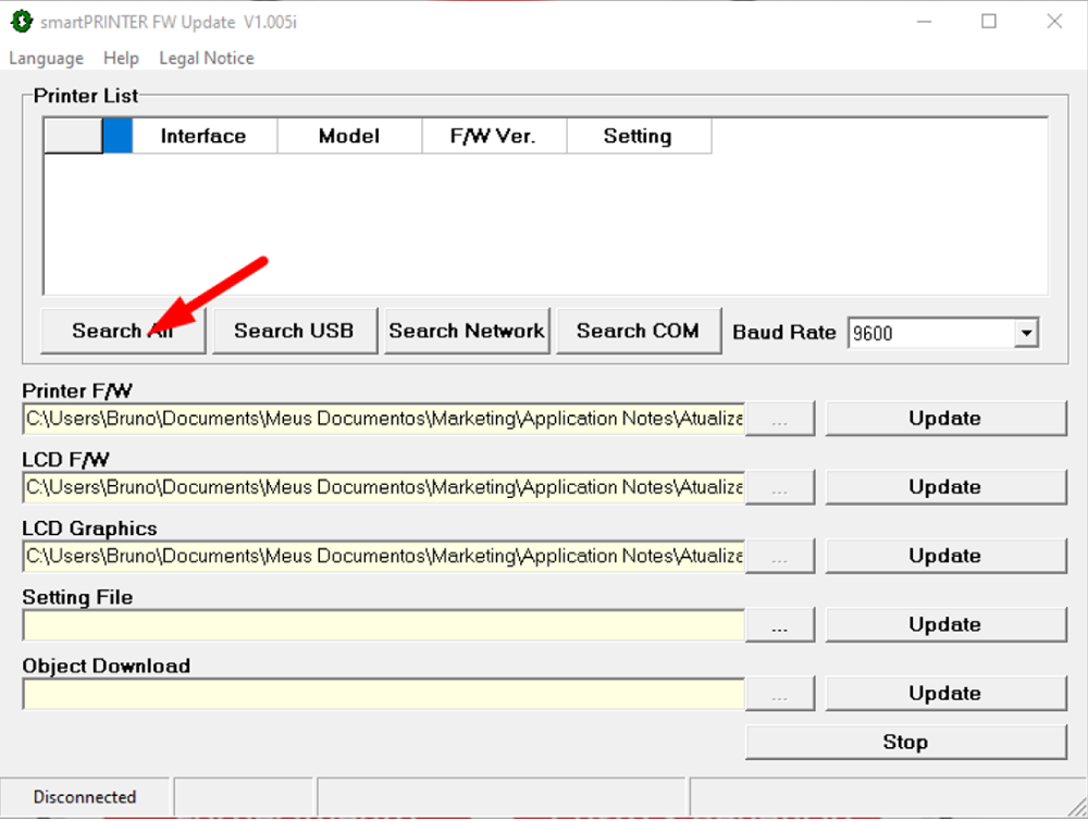 Com o software aberto, clique no botão Search All para localizar a impressora conectada ao seu computador.