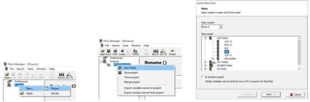 b) Iniciar um novo projeto para adicionar os controladores. Em nosso exemplo, serão três “Pluto D20”: