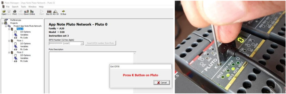 c) Na após adicionar os controladores, eles estarão listados na árvore lateral, onde devemos selecionar cada um para ler o número do módulo IDFIX que conectamos previamente. Ao pressionar o botão “Read IDFIX number from Pluto” na tela do programa, uma mensagem será exibida na tela, solicitando que o botão físico “K”, do Pluto correspondente, seja pressionado. O botão “K” fica bem ao lado do conector frontal do Pluto, e necessita de um objeto estreito, como um clipe de papel, para ser acessado: