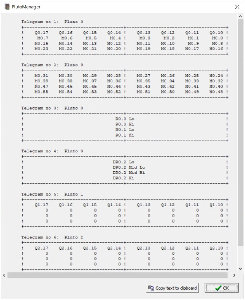 As variáveis exportadas são transmitidas na rede através de telegramas extras, que são pacotes de 32 bits de dados. Cada Pluto pode exportar até 4 telegramas, equivalente a 128 bits, que podem ser ocupados por memórias simples (1 bit), registradores (16 bits) ou registradores duplos (32 bits). Memórias de sistema e registradores de sistema não podem ser exportados diretamente.