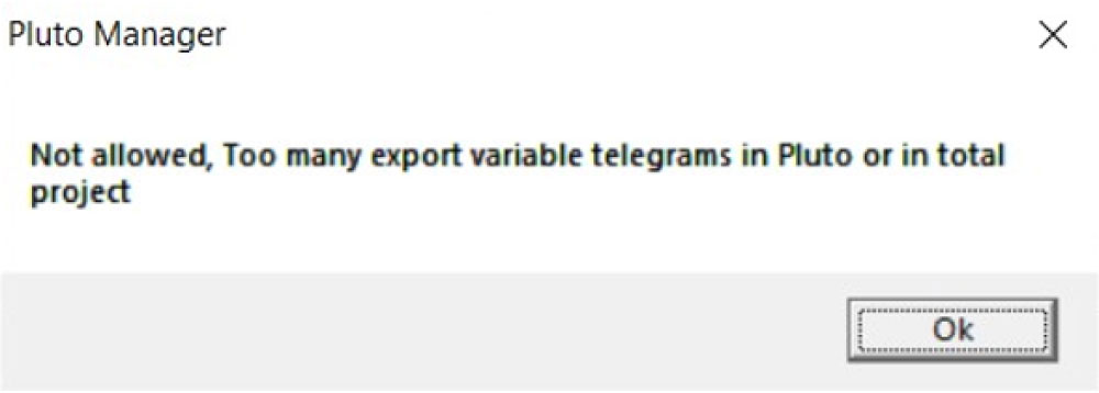 Se tentarmos exportar mais variáveis do que esses 4 telegramas comportam em um único Pluto, ou mais de 16 telegramas no projeto como um todo, uma mensagem será exibida no programa, alertando que o limite foi atingido: