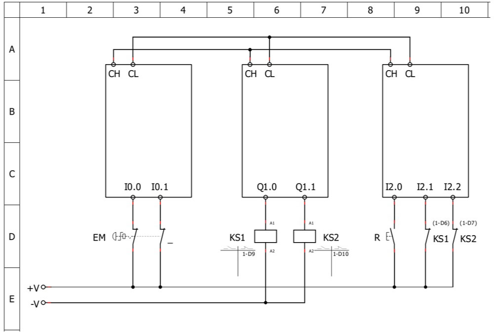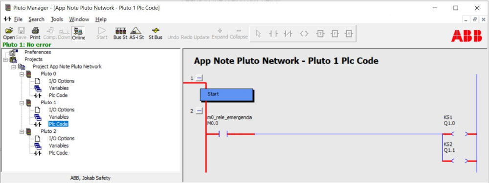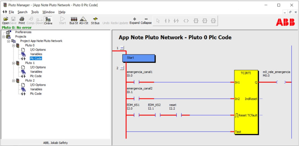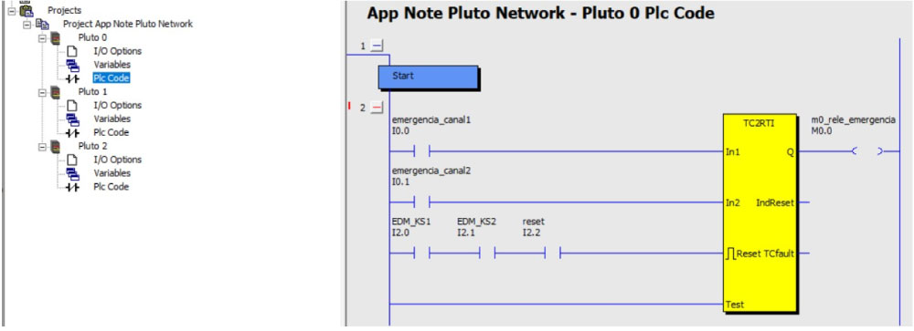 A título de exemplo, vamos criar um programa onde o Pluto 0 monitora um botão de emergência através das entradas seguras I0.0 e I0.1. Os contatores de bloqueio estarão nas saídas seguras Q1.0 e Q1.1 do Pluto 1, e os sinais de EDM dos contatores e do botão Reset estarão respectivamente nas entradas I2.0, I2.1 e I2.2 do Pluto 2.