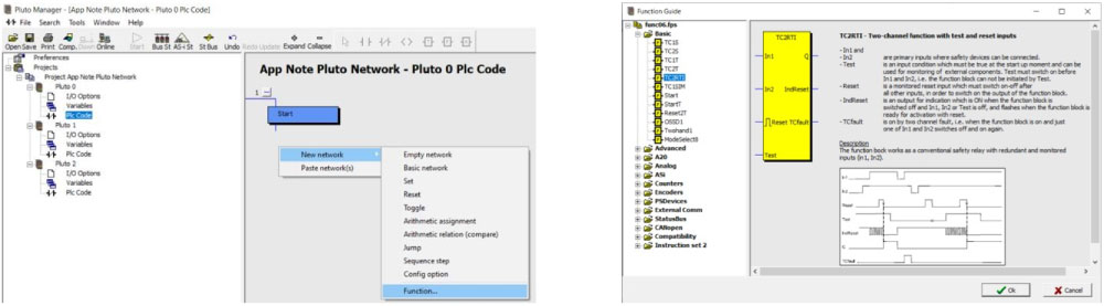 A seguir, implementamos o código para Pluto 0, criando uma nova Network do tipo “Function” no respectivo subitem “Plc_Code”, e escolhemos um bloco de função para o relé de segurança: