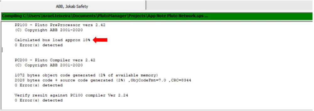 O compilador verifica se há erros de programação no projeto e também calcula a taxa de utilização da capacidade da rede, com base na quantidade de variáveis, na velocidade de tráfego e na frequência de atualização. Neste exemplo, estamos utilizando 18% da capacidade da rede: