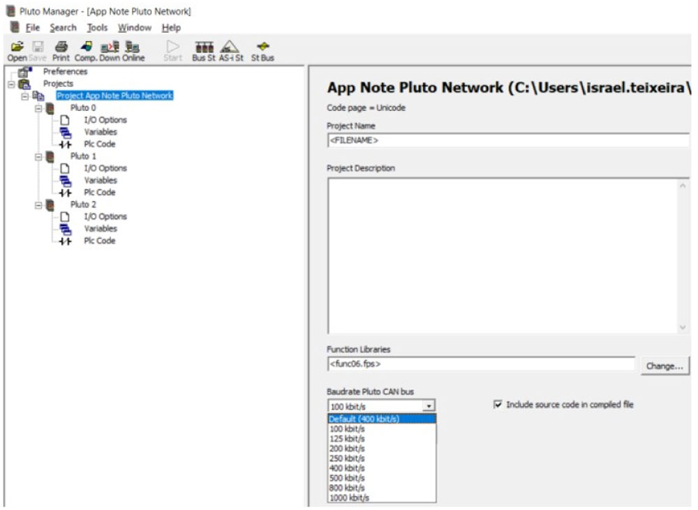 a) Na caixa de seleção “Baudrate Pluto CAN bus”, escolha uma velocidade entre 100kbps e 1000kbps:
