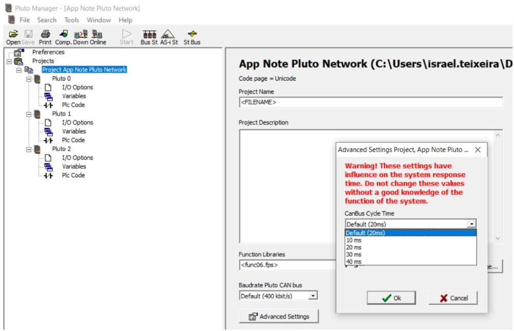 É recomendado que a carga da rede não ultrapasse 60%. Se isso ocorrer, ajuste o tempo de ciclo ou a velocidade da rede. Ambas as configurações são acessadas com um clique sobre o nome do projeto na árvore lateral: