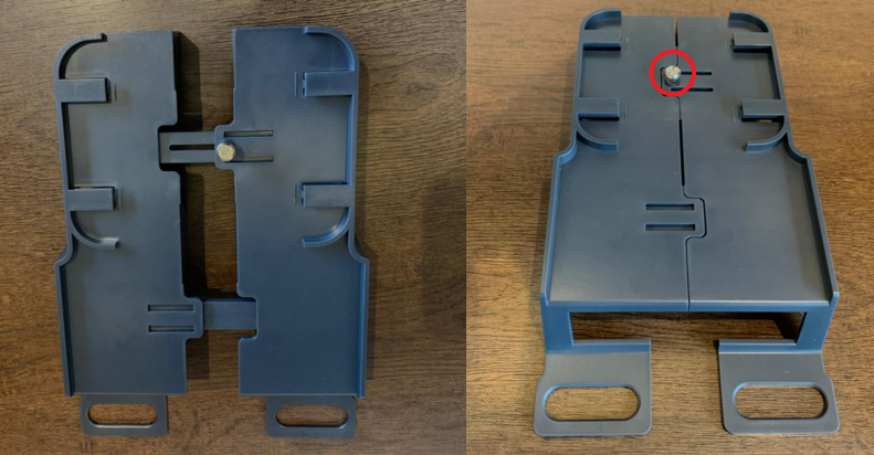 Primeiro deve-se montar a base do suporte, as duas partes possuem os encaixes para montagem, e juntamente com um parafuso para fixar os dois lados da base.