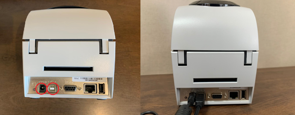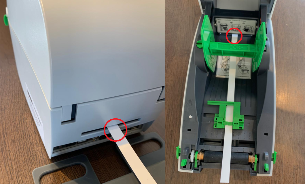 As identificações externas devem passar pelo espaço na parte traseira da impressora conforme indicado nos círculos.