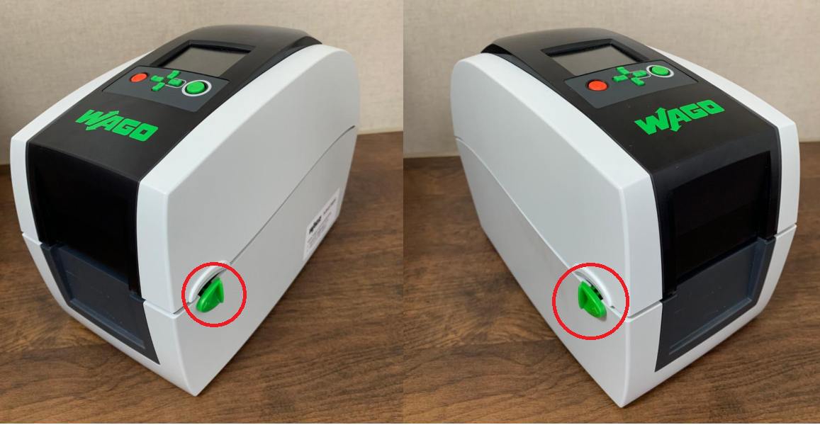 Para abrir a SmartPrinter deve ser feito a liberação das travas laterais, conforme identificado na imagem acima, as travas possuem uma flecha indicando a direção correta para destravar.