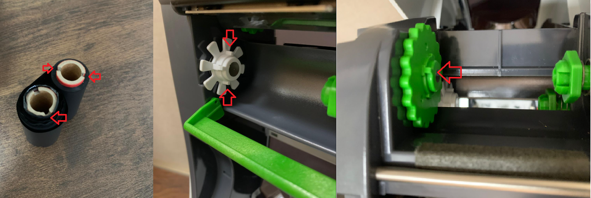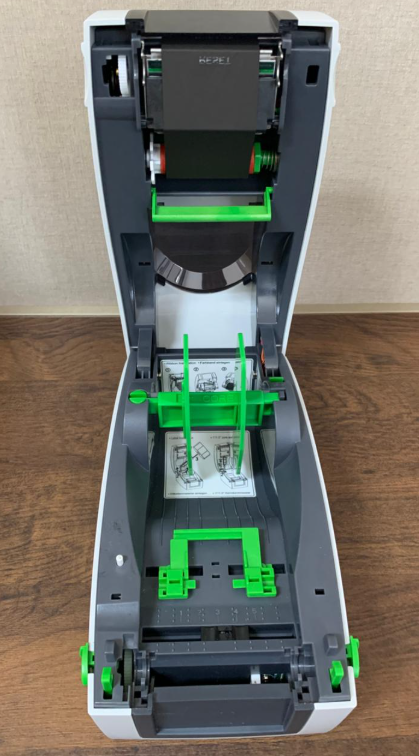 A impressora vem acompanhada de um Ribbon novo, que deve ser inserido na parte superior da impressora. Conforme a imagem aponta, os locais de encaixe possuem as marcações e ranhuras para que a montagem se mantenha fixada.