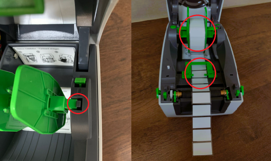 Na primeira imagem está marcada a trava para liberar a haste onde será instalado o rolo de identificação que depois deve ser ajustado ao centro com as guias laterais, um pouco mais abaixo terá outra guia para manter as etiquetas centralizadas.